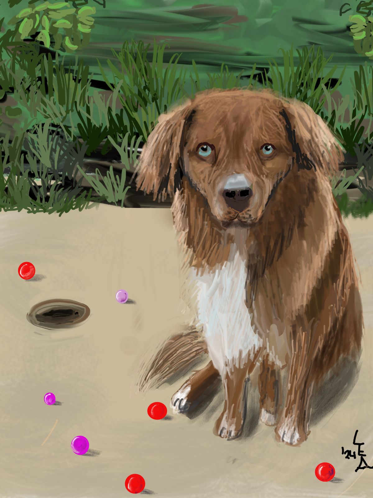 Als uiteindelijk is bepaald dat het buurmeisje de eerste kans krijgt draaien ze zich om naar ‘de pot’. Kwispelend zit Bruno in het midden van het speelveld. Beteuterd kijken ze naar wat over is van hun spel. Boos worden op die lieve Bruno is geen optie.