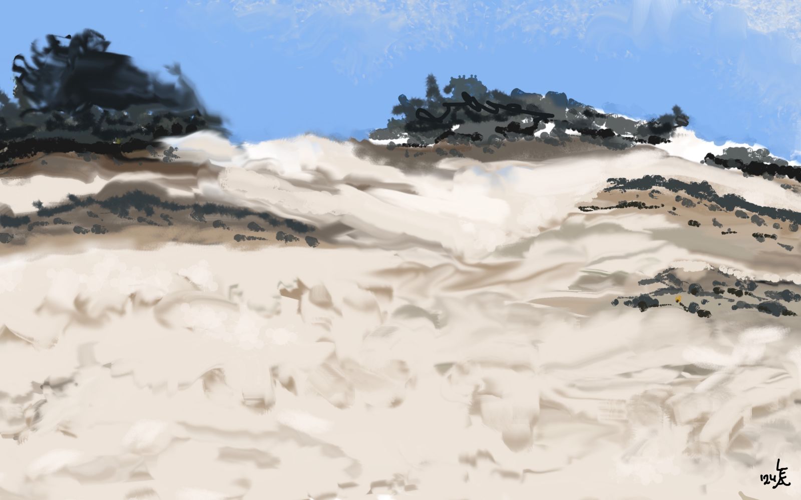 Wanneer ik het ruisen van de A28 hoor verlaat ik het bos om het Hulsthorsterzand over te steken. Deze woestijn is een van de grootste stuifzandgebieden van Nederland. Hier blijkt dat ik mijn conditie heb overschat. Het is zwaar om door het losse zand de duin op te klimmen. Mijn achillespees laat zich voelen. Dat doet me besluiten om mijn wandeling in te korten. Op TopoGps kies ik kleine bospaadjes die me sneller naar station Nunspeet leiden. En juist op mijn alternatieve pad kom ik een tweetal mannen tegen, druk in de weer met hun radiografisch bestuurde SUV’tjes. Ze gaan helemaal op in hun hobby en hebben niet in de gaten dat ze niet alleen zijn. Hun mini 4-wheeldrives beklimmen moeiteloos het zanderige bospad. Als ze uit zicht zijn, vervolg ik mijn weg.